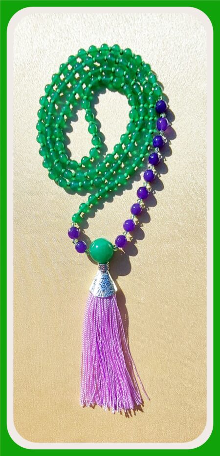 Este sencillo y elegante Japa Mal está hecho con 98 cuentas de Jade Verde dividido en 97 de 6mm redondas y 1 centro focal de 18mm redonda todas unidas con cuentas de cristal.  Se finaliza el diseño con 11 cuentas de 8mm de Amatista unidas también con atractivos cristales.  Metales plateados